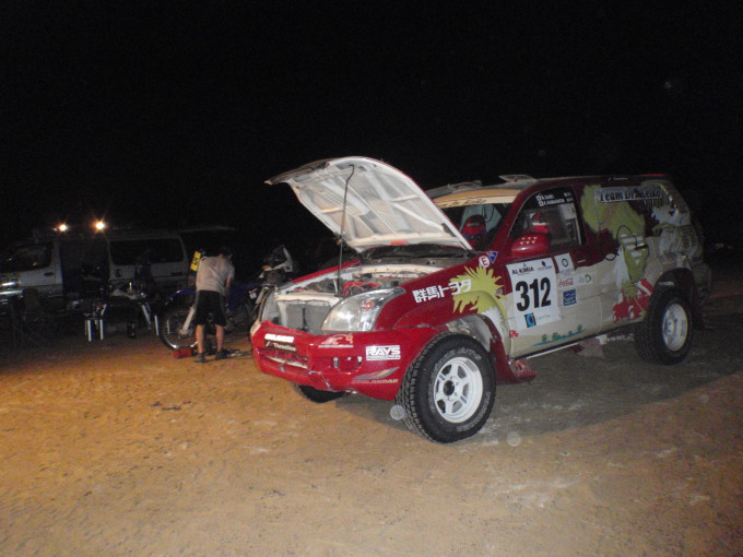夕食と同時に暫し休憩をした後に、プラドの整備に入りました。スタート直後から異変を感じていたブレーキ系統を見て頂き、とりあえず、現場で対応可能な範囲で対処をして頂きました。気付けば、スタート直後はブレーキの不安があり、果たして今日1日走れるだろうか… という暗雲が立ち込めていましたが、何とかほぼ1日、無事に走る事が出来ました。