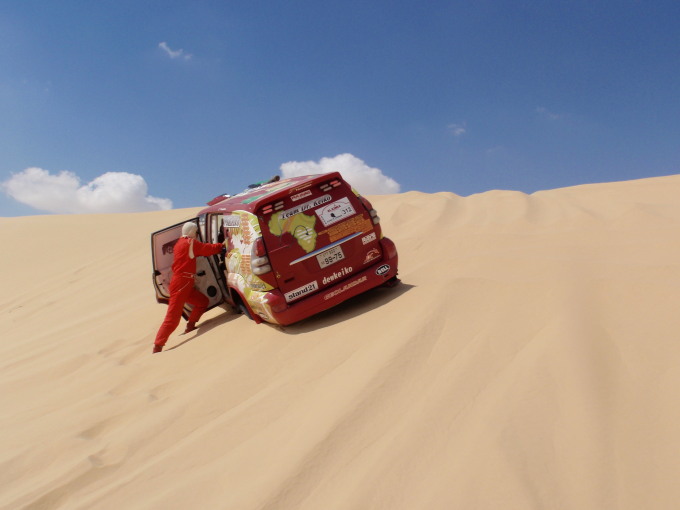 何とか蟻地獄エリアを通過して3km 程進むと、今度はクラシッククラスのパジェロやランクルが3台、止まっていました。どうやらスタックをして、脱出作業をしている様子でした。その横を通過して、次の砂丘を越えようとした時です。完全に砂丘越えに対して大きな恐怖心を持っている私は、迷わず頂上手前でアクセルを緩めました。本来であれば、いつも以上に砂が深いエリアですので、更なる勢いとアクセルコントロールが必要な場面でした。しかし、砂丘への恐怖だの選手のスキルなど、ラリーの現場では皆平等で、ファラオの神様も、その現実を真正面から突き付けてきました。