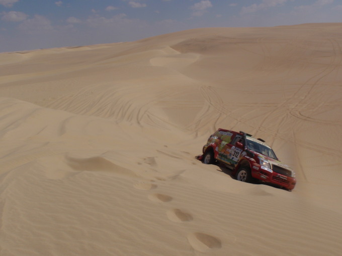 CP3 からCP4 までの約80km は、フカフカのエリアを通過する事もあれば、連続する高い砂丘越えが続く場面もありました。フカフカのエリアでは、再度自分の中で迷いが生じると、プラドは斜面に対して斜めになって止まってしまう状況でした。1日の中で2度同じ状況でスタックをしてしまう自分に、成長のなさを実感しました。