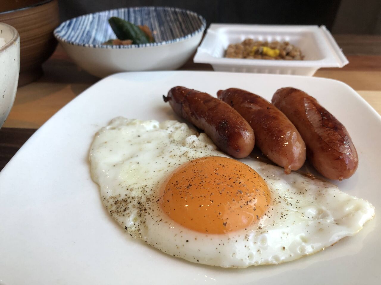 目玉焼きの皿が大きいから、目玉焼きとソーセージを端に寄せて上のお浸し?を皿の上に乗っけよう