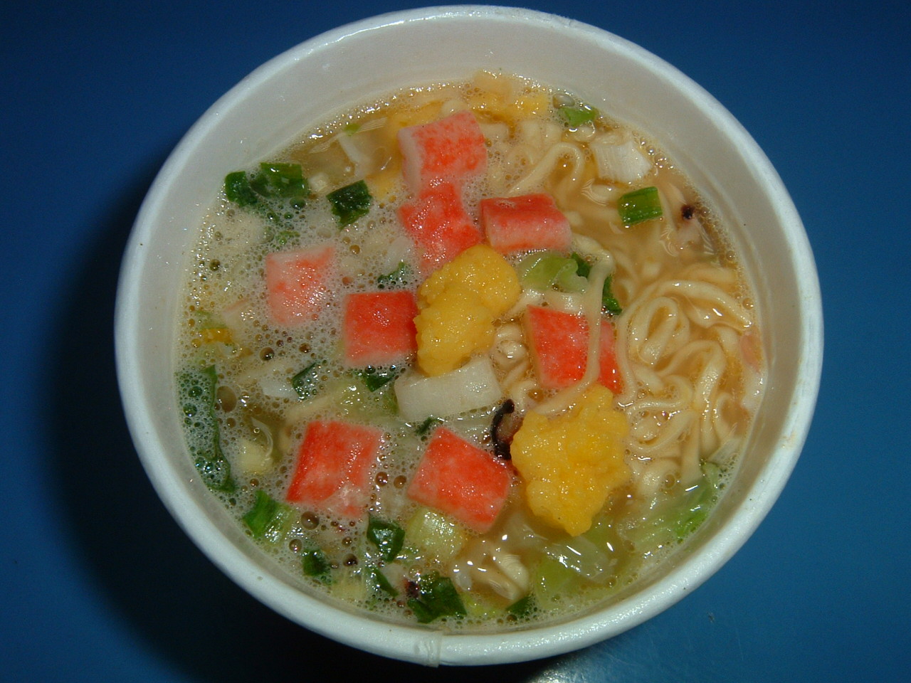 スープはあからさまにカップヌードル シーフードヌードルを意識した出来上がり。美味しいが釈然としない。