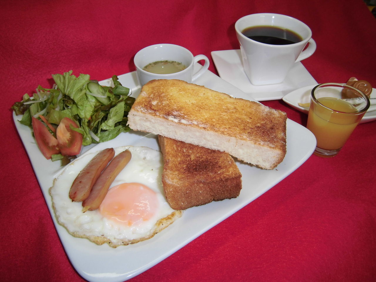 トースト、サラダ、目玉焼き、ウィンナー、スープ、プチオレンジジュース付き