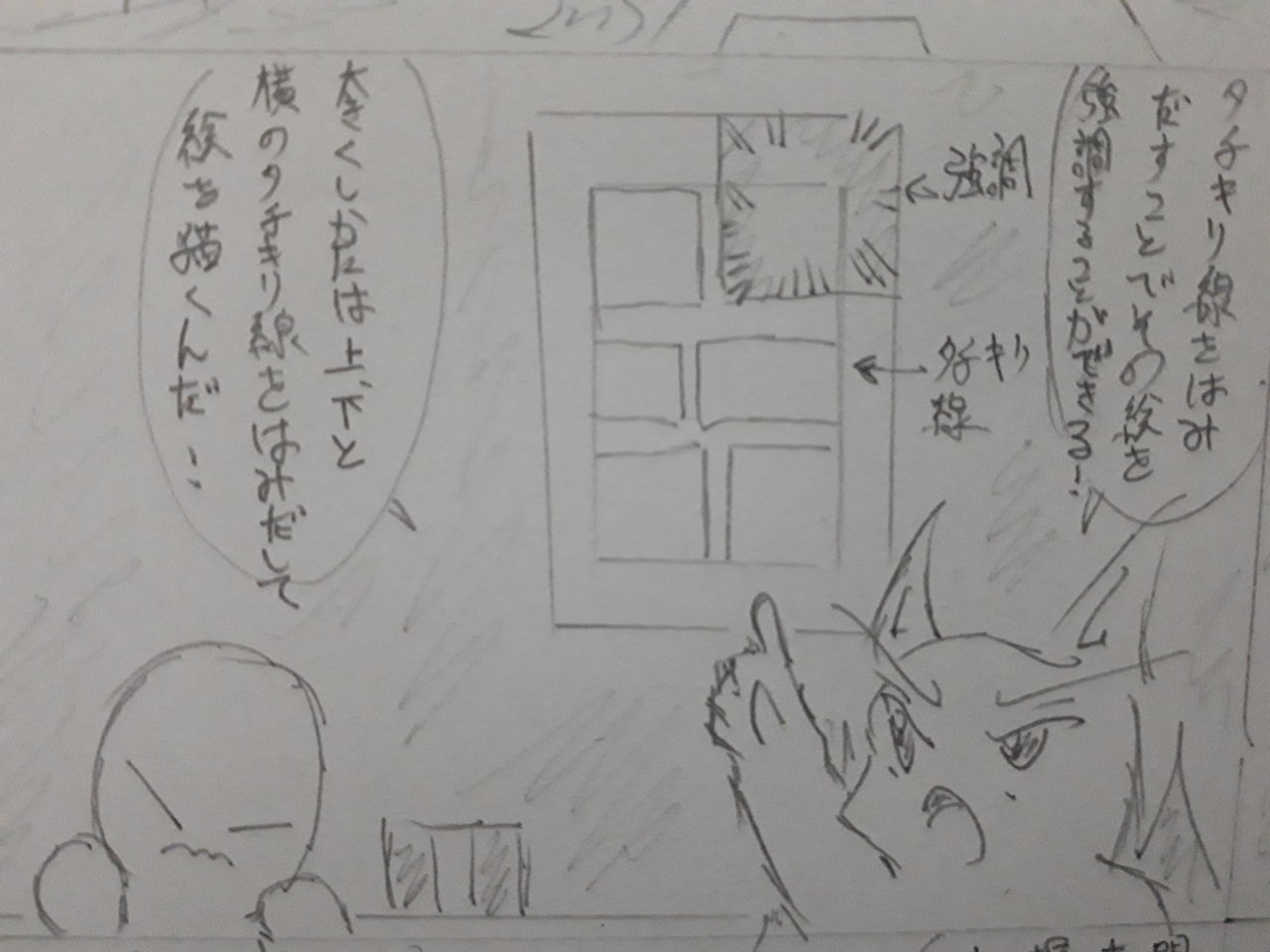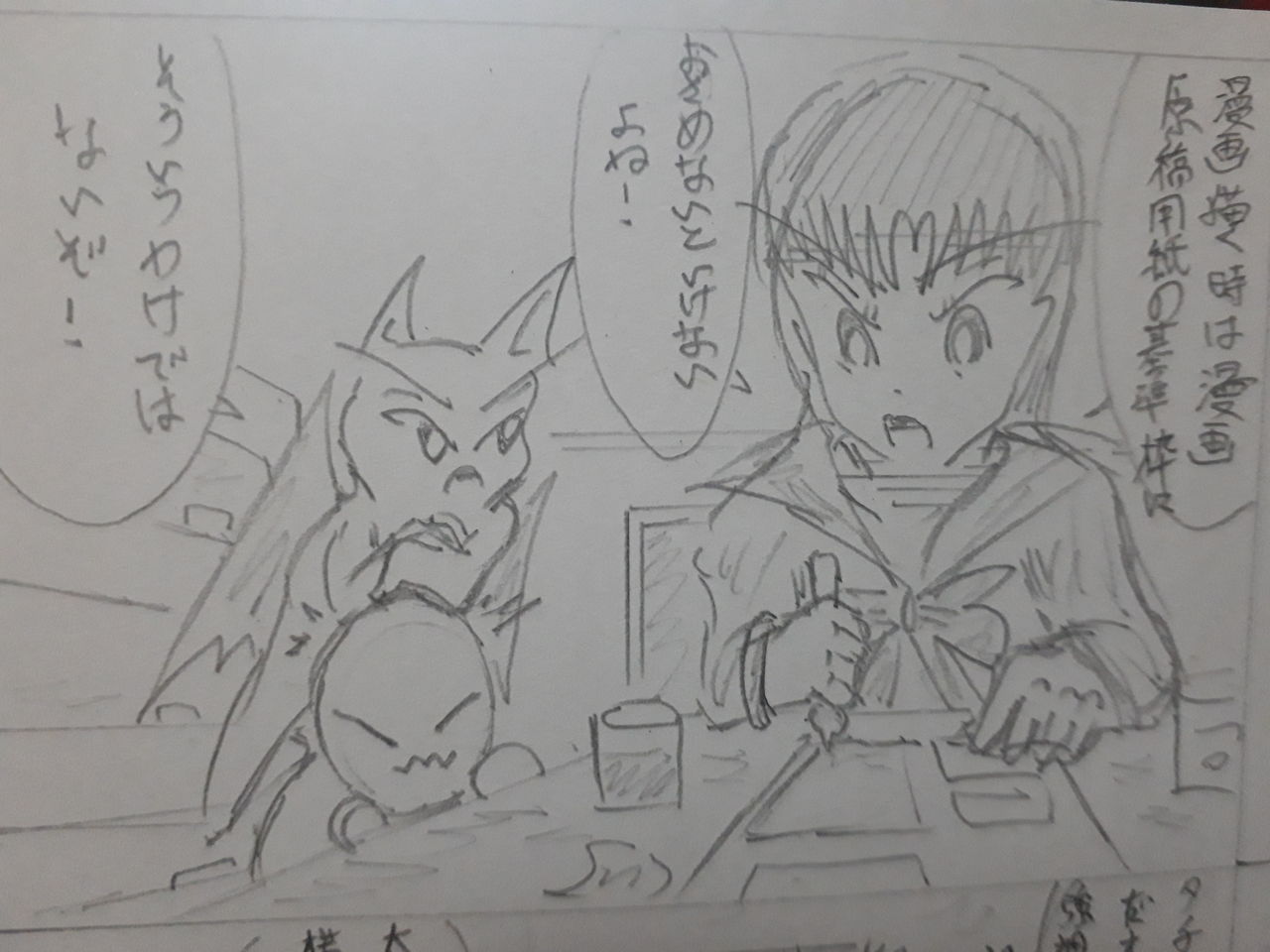 第4回の漫画原稿用紙のススメではコピー用紙に絵を描くよりも漫画原稿用紙に絵を描いたほうが漫画原稿用紙になじみやすくなることと紙質の変化があるため描きにくいという問題をカバーできるというふうに紹介していました。4コマ化してもあまり面白くないと思いましたので今回は漫画原稿用紙の使い方を描くことにしました。
