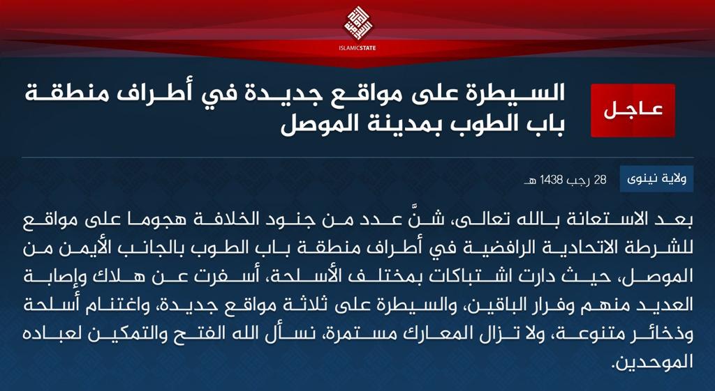 モスルのほとんどを失いながらも、防衛戦に終始することなく一部の地域を奪還、さらに遠隔地にまで攻撃の手をのばしていること、モスルからラッカ、デリゾールへと首都機能を移転させていること、指導者であるカリフ、バグダーディーも数ヶ月前にデリゾール方面に脱出し、健在だと伝えられていること・・・これらのみを考慮しても、イスラム国が力を失ったと安心するのは時期尚早であるといえます。