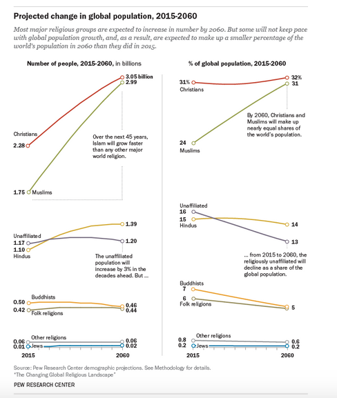 その結果、2060年までには、イスラム教徒とキリスト教徒の総数はほぼ拮抗することになります。