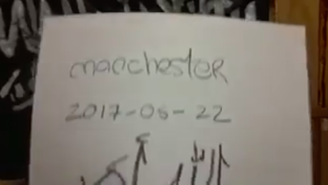その後、「神は偉大なり!」と繰り返し言いながら、「manchester 2017-05-22」と書かれた紙を掲げます。