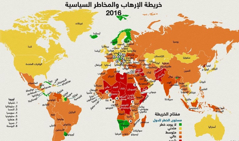 テロのリスクの高低を世界地図に落とし込んだものが、こちらです。