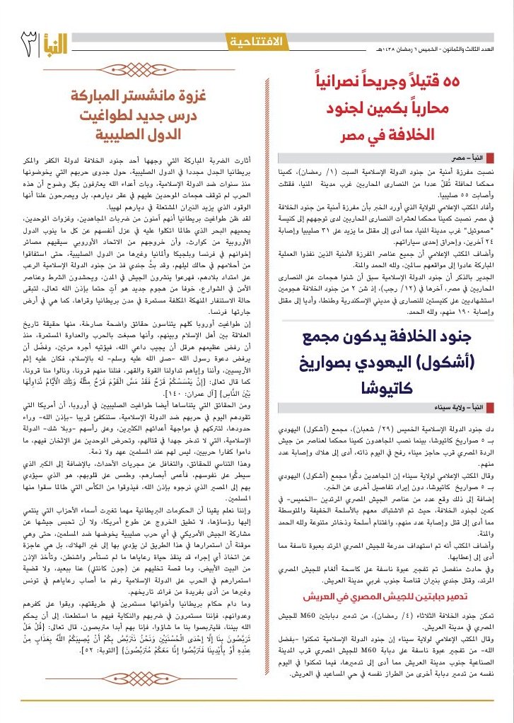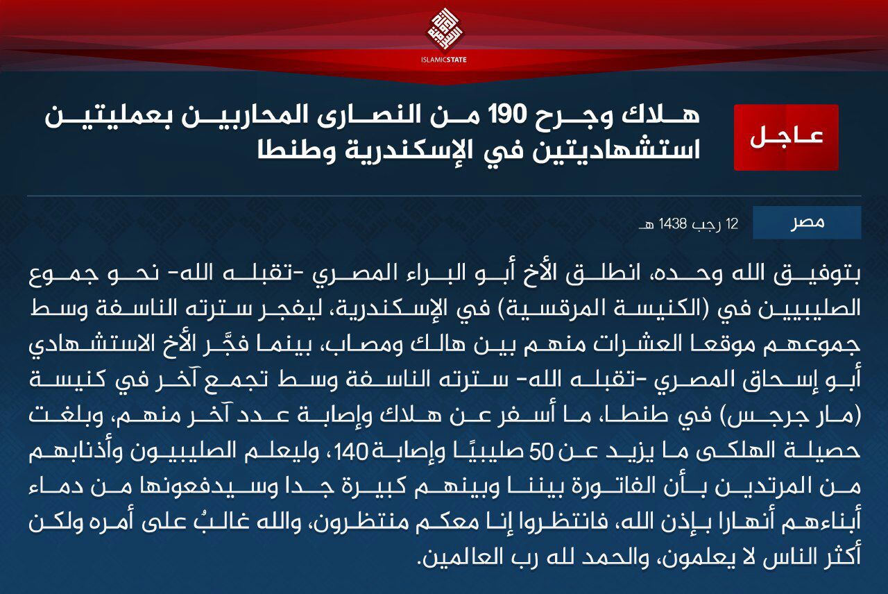 犯行声明を出したのは過激派組織「イスラム国」で、声明文には、2人のエジプト人「同胞」(「兵士」ではありません)がタンターとアレクサンドリアにある教会でそれぞれ自爆し、190人のキリスト教徒を死傷せしめた、と記されています。