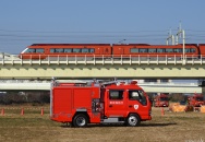多摩川河川敷のいすゞ エルフ消防車と小田急のロマンスカー