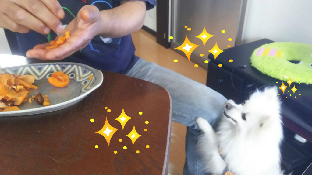 いただきまぁ~す!!テーブルの下の台みたいなところでドリちゃん・いち君