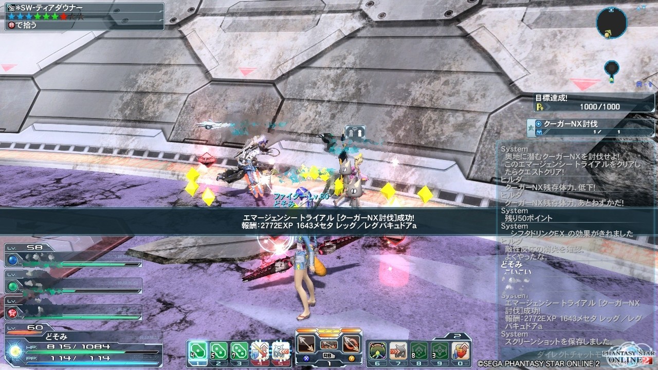 昨日からシーちゃんのオーダー増えてるんでクーガーNX倒しに行ったんですよ。するとレアクーガーが一発目で出て幸先いいなー、でもまたメセタリングっすかーとか思ってたわけですよ