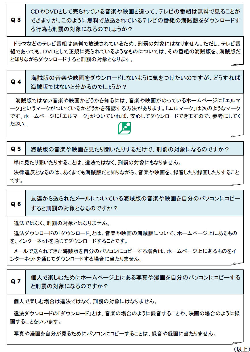文化庁が公式サイト上にて「違法ダウンロードの刑事罰化についてのQ&A」と「違法ダウンロードが罰則の対象となることについて知っておきたいこと(子ども用)」というPDFファイルを公開しており、かなり参考になる記述が見受けられます。