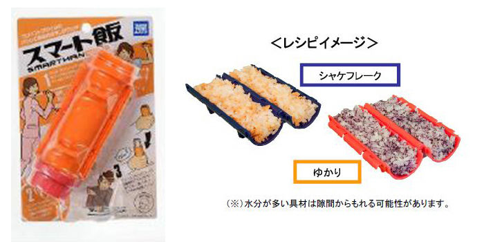「おもしろお弁当シリーズ」の第1弾として発表されたこの「スマート飯」は、ご飯を容器に詰めて蓋をし、スティックを押し出すと、誰でも簡単に、のり巻き状のおにぎりを作ることができるというもの。
