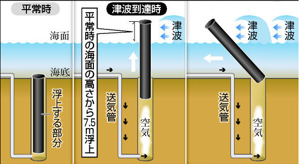 津波が来たら防波堤出現 三菱重工など、和歌山に建設へ三菱重工業と大林組、東亜建設工業の3社は29日、津波のときに浮き上がらせる防波堤を和歌山県海南市の和歌山下津港につくると発表した。「世界初の技術」といい、ふだんは海底に埋まっているため、船の航行にも影響がなく、景観も損ねない。10月初旬に着工する。