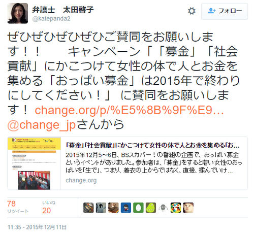 12月5日、6日に開催された『STOP! AIDS チャリティー 24時間テレビ エロは地球を救う!2015』の名物企画である「おっぱい募金」。今年は大盛況で過去最高の7175人の来場者となった。しかしこんなチャリティー企画に待ったをかける人が居た。女性弁護士の太田啓子さんで「怒れる女子会」を広めているる弁護士でもある。太田啓子さんはFacebookで「ここ数日憤怒していた「おっぱい募金」の件、チェンジオルグでキャンペーンが立ち上がっています。ぜひ賛同して下さい」としている。
