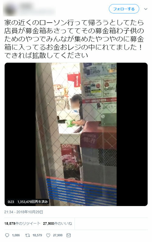 ローソン店員が募金箱のお金をレジに中にいれている!――お店側が募金で集まったお金を横領しようとしていると言わんばかりのツイートがTwitterで拡散されました。でもこれ、単に募金額を集計しているだけなんです……。ツイートが投稿されたのは10月29日(現在は削除済み)。店員が募金箱のお金を取り出してレジに入れる様子を撮影した動画が添付され、2万5000件近いRTを稼いでいました。しかしリプライ欄では「単に集計しているだけ」「店員がかわいそう」「何でも盗撮して拡散すればいいってもんじゃない」と、ツイートを訂正しようとするコメントや、ツイート主への批判が殺到。