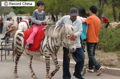 最近、ディズニーを模倣したと言われる、北京市の石景山遊楽園が注目を浴びているが、そもそも中国といえばDVDの違法コピーや偽ブランド品をはじめとする「海賊版大国」として知られている。服・鞄・時計・DVDといったありがちなものから、食品・卒業証明書・資格試験の合格証など、ありとあらゆるものにニセモノがあると言われるほど。しかし、このゴールデンウィークに今までになかった、全く新しいニセモノが登場した。この革新的なニセモノが登場したのは、吉林省長春市の動物園で行われているシマウマの騎乗イベント。騎乗イベント会場に到着すると、すぐに問題の「シマウマ」を発見。体にはシマウマの特徴である縞が刻まれているが、しかしどことなくシマウマとは違う。写真を見ればわかるが、特にたてがみの差異が明らかだ。普通のシマウマは黒一色なのに対し、この「シマウマ」は白と黒が入り交じっている。