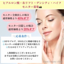 たるみ治療のモニター様募集を行っています。【募集内容】糸リフトヒアルロン酸注入ハイフ&デンシティたるみが主訴の場合でも、糸リフトが適応の方、ヒアルロン酸注入が適応の方、ハイフ・デンシティが適応の方がいらっしゃいます。【糸リフト】・下顔面のたるみが気になる ...