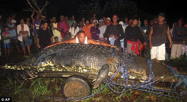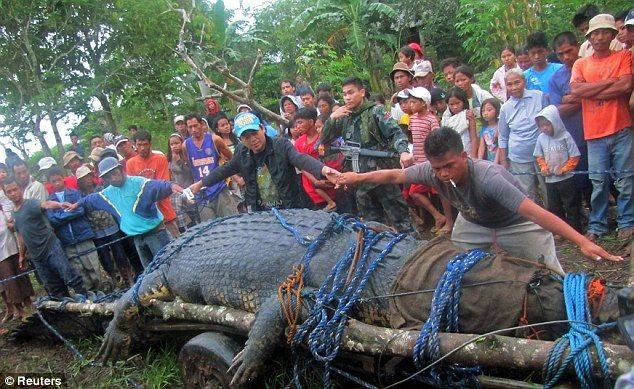 Snapped up: Villagers capture world's largest crocodile (which weighs one ton and is 21ft long)