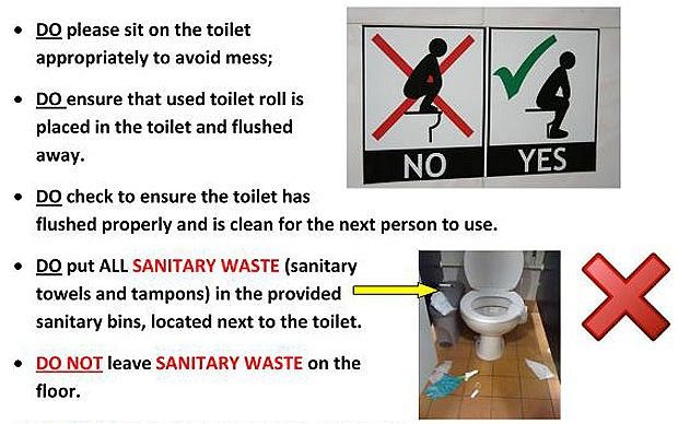 スウォンジー大学にはトイレの使い方を留学生に注意するこんな張り紙がある