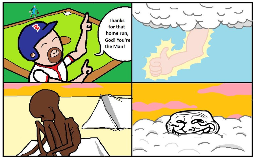 極悪な神:世界中で何百万人もの新生児が病気や栄養失調で亡くなるのを放置。その一方でアメフトの試合に入れ込み贔屓のチームが勝利するように全力で手を出す。