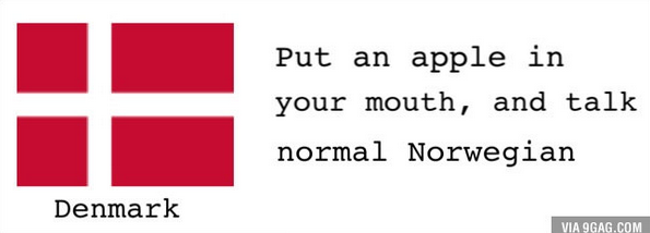 デンマーク語「口の中にリンゴを入れて普通のノルウェー語を話すようにする」