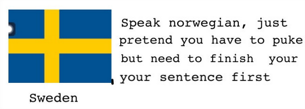 スウェーデン語「ノルウェー語のように話す。ただ、吐きそうだけど先に話し終えてしまおうとするような感じで」