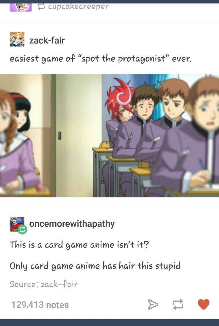 「これカードゲームのアニメだろ?こんな馬鹿げた髪型してるのはカードゲームアニメ位だからな」
