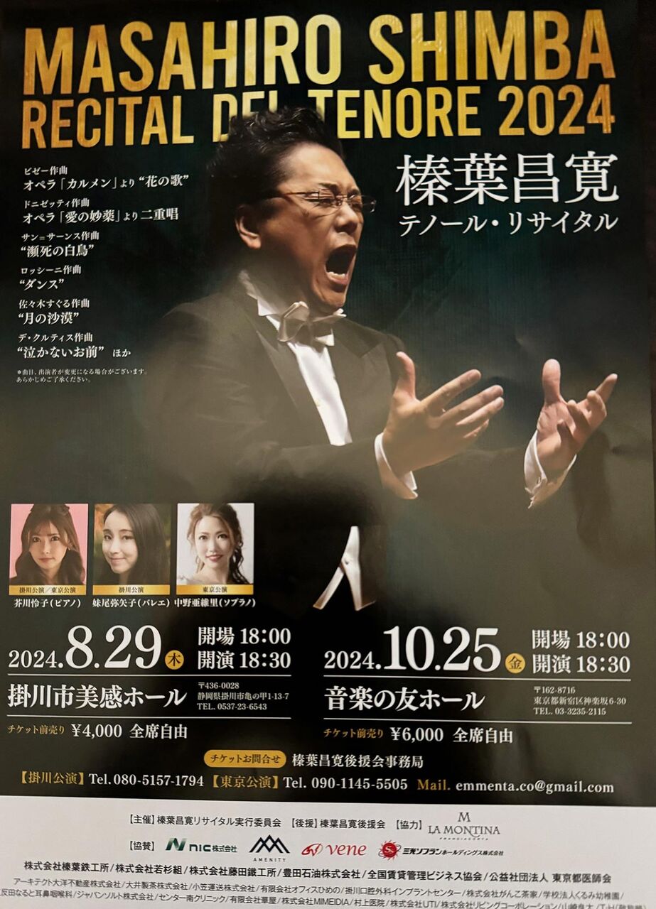 2024年08月30日 榛葉昌寛・テノール・リサイタル2024 当医院が協賛していて地元掛川応援大使でもあるテノール歌手の榛葉昌寛さんのリサイタルが掛川市美感ホールで開催されました。10月には東京公演も開催されます。