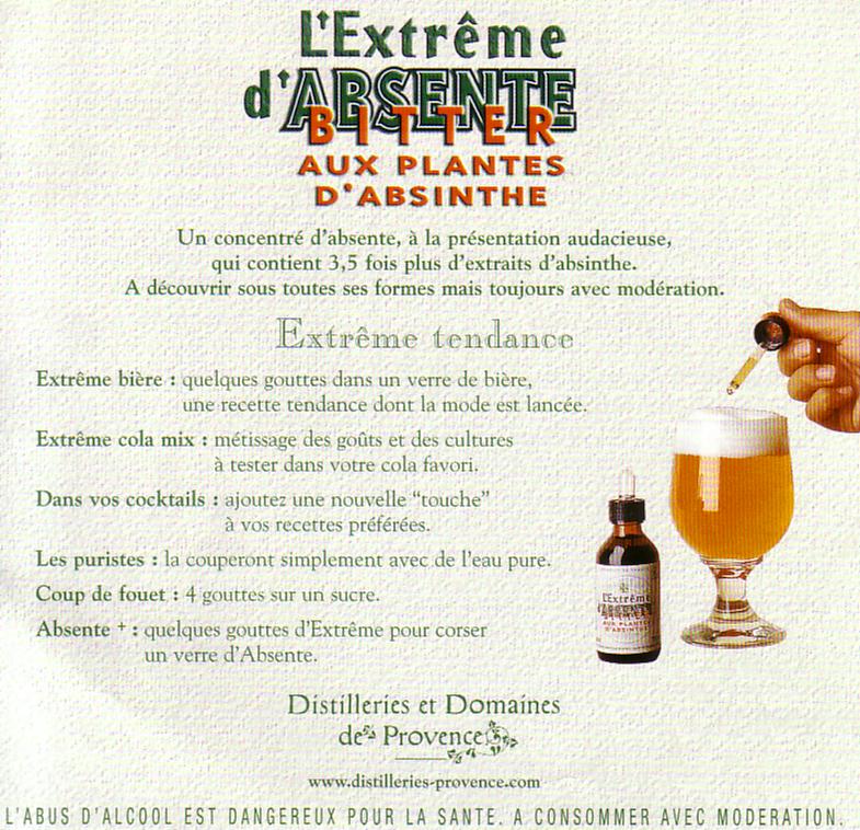 つまり、前回のBlogで僕が勘違いして買い占めたものは元々のオリジナル版ではないらしい(涙)。とりあえず棚に置いてあったものを2回に分けて全部買い占めたから、出費は2万円程度。一気に飲めるものではないので5年くらいかけて消費していきたい。さて、そのリニューアルされたエクストリーム・アブサントを購入したとき、リカーズ・ハセガワでTopにあるようなチラシをもらった。見てご覧の通り、ビールにエクストリーム・アブサントを垂らして飲むようだ。これは面白い!