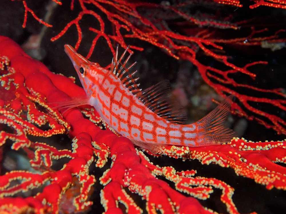 枝珊瑚にはテングカワハギが隠れんぼしています