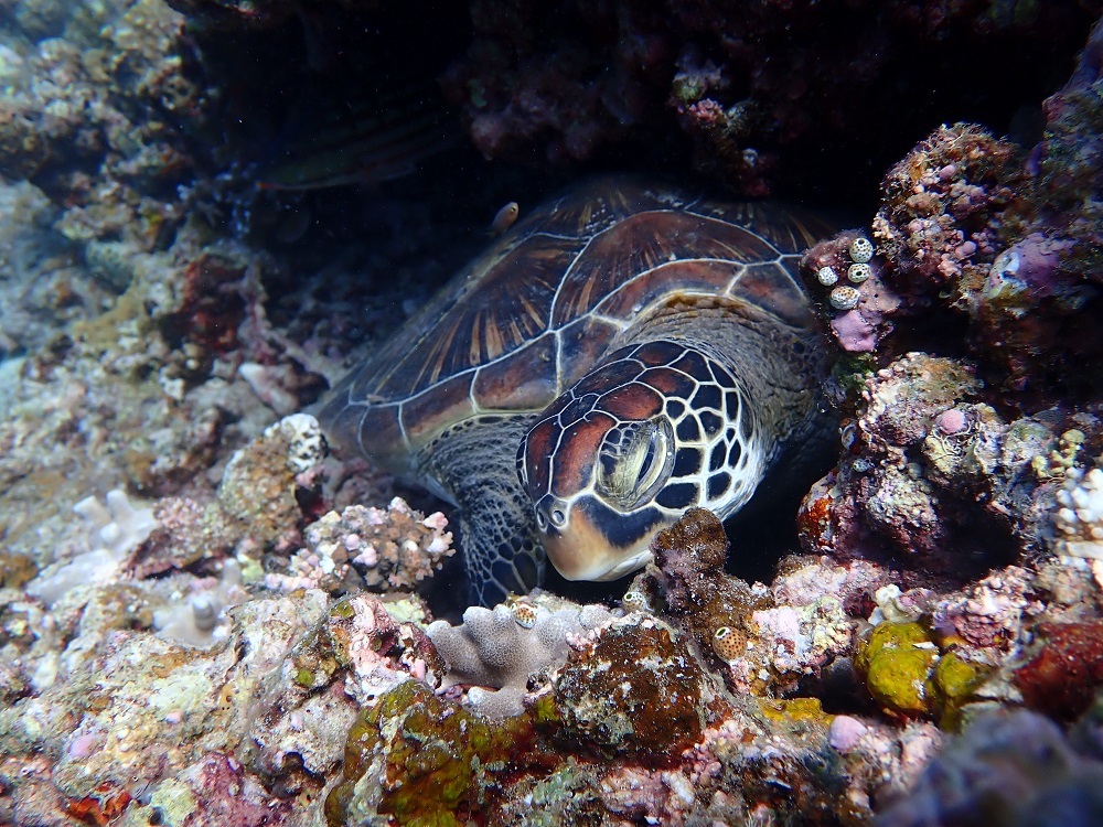 進んでいるとお休み中の大きなアオウミガメがいます
