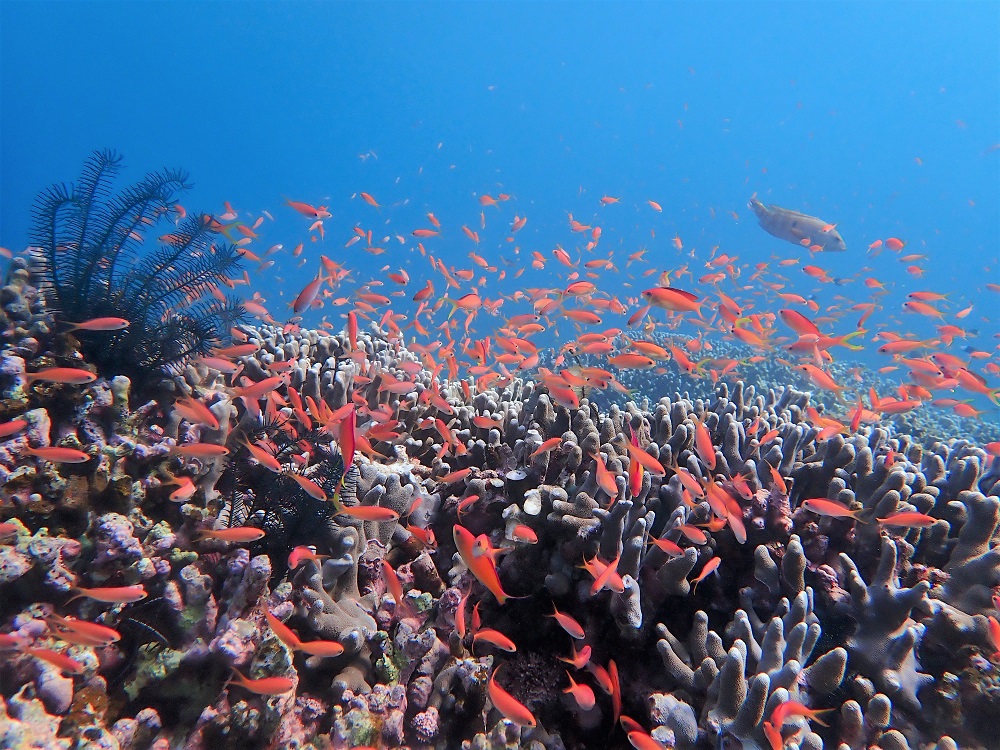 枝珊瑚に無数のスズメダイが群れていて幻想的な空間を演出してくれます