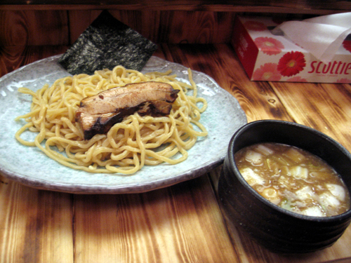 オレッチがオーダした、つゆ無し担担麺は、ストレートの平たい太麺で、山椒&ラー油を入れた、あまり辛味の無い胡麻ダレを良く絡めて食べると、甘さが引き立つ感じです。