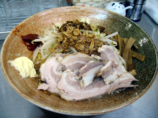 大きな扇風機があるカウンター席のみの店内に入りメニューを見ると、つけ麺、ラーメン、まぜそばとあり、店頭メニューの写真で桜えびが入っていた「まぜそば」をパスし、つけ麺、ラーメンで迷いましたが、本日は2軒ともつけ麺だったので、ラーメンをチョイスします。