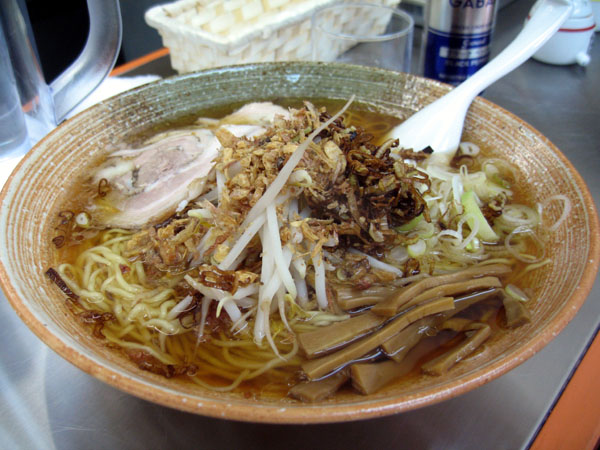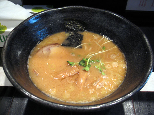 出てきたラーメンは、ドンブリの大きさからでしょうか、スープ&麺が少し少なく感じちゃうもので、トロミ&甘味のある魚介風味もする豚骨醤油スープです。