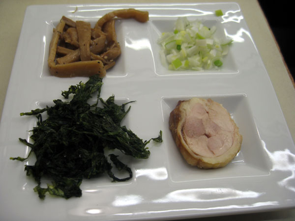 本枯中華そばの食券を購入して、テーブル席に座って食券を渡すとトッピングが鶏オーブン焼き、タマリ浸け叉焼、ウズラ、メンマ、岩のり、キクラゲ、なると、ちんげん菜の中から3種類選べるようで、FILEさんと被らないようにして鶏オーブン焼き、岩のり、メンマ(写真2)をお願いいたします。