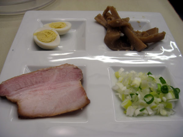 提供された本枯中華そばは、素らーめんの形と、具は別皿で提供されるようで、この時点でFILEさんがオーダしたタマリ漬け叉焼、ウズラ、キクラゲを半分に・・・。