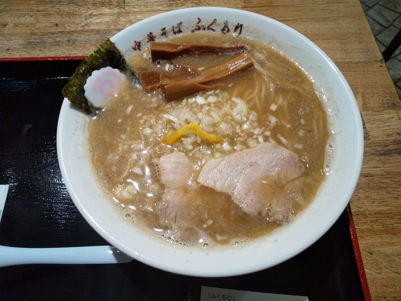 具などは、ローストタイプのチャーシュー、小松菜、粗微塵の玉ネギ、薬味ネギで、小松菜のシャキ加減が良いですね♪