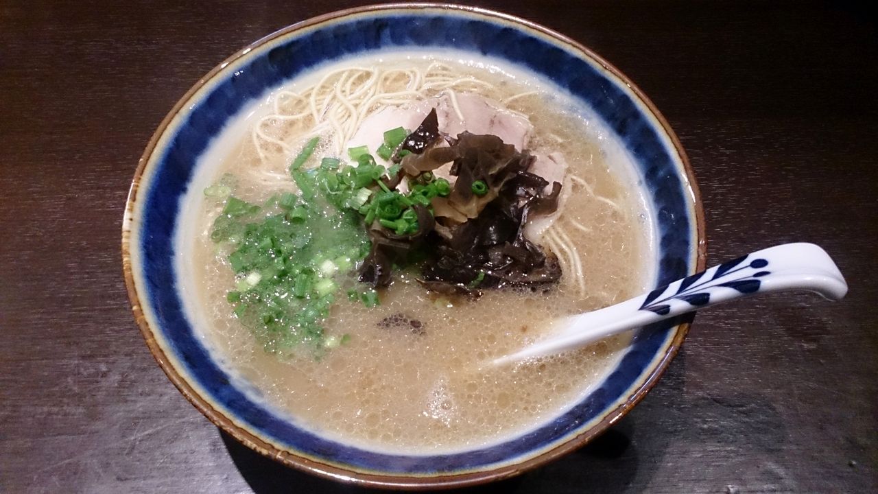出て来た豚骨ラーメンは臭みのない豚骨スープで、髄などのザラつきもなく、トロッとした感じのもので旨味も適度な感じのものですね。