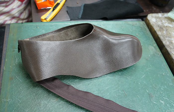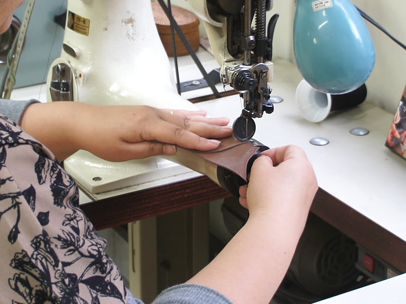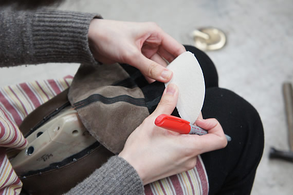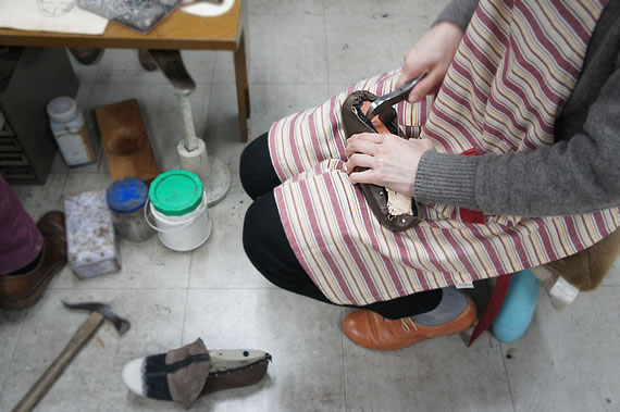履き口についている革を、いちきりできれいに切り取っていきます。