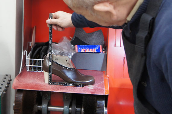 きちんと木型に合うヒールを選ぶことが大切なんです。斎藤先生が定規で見ながら生徒さんに解説しています。