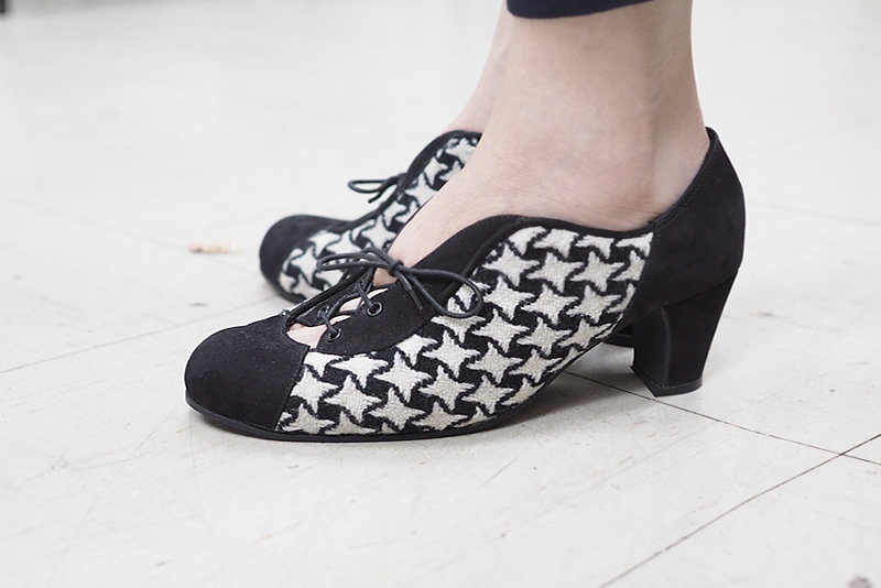 起毛革に白黒のチェックはなんと布!生地は全部ご自身で用意していただいてこだわりの一足になりました!