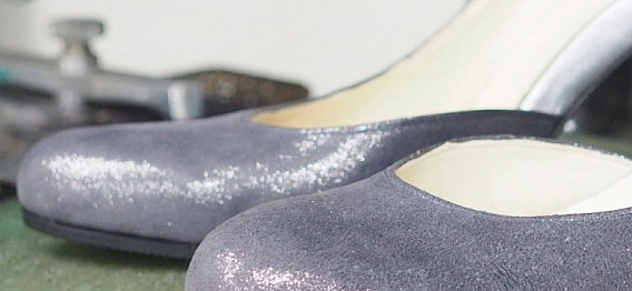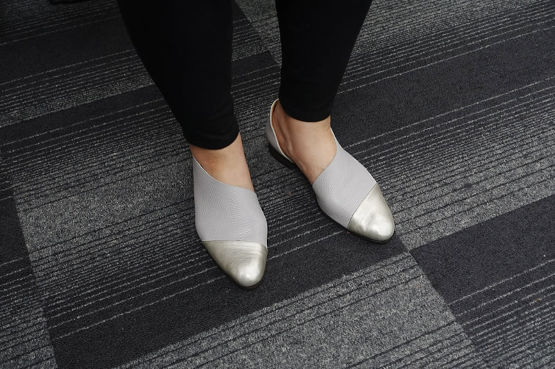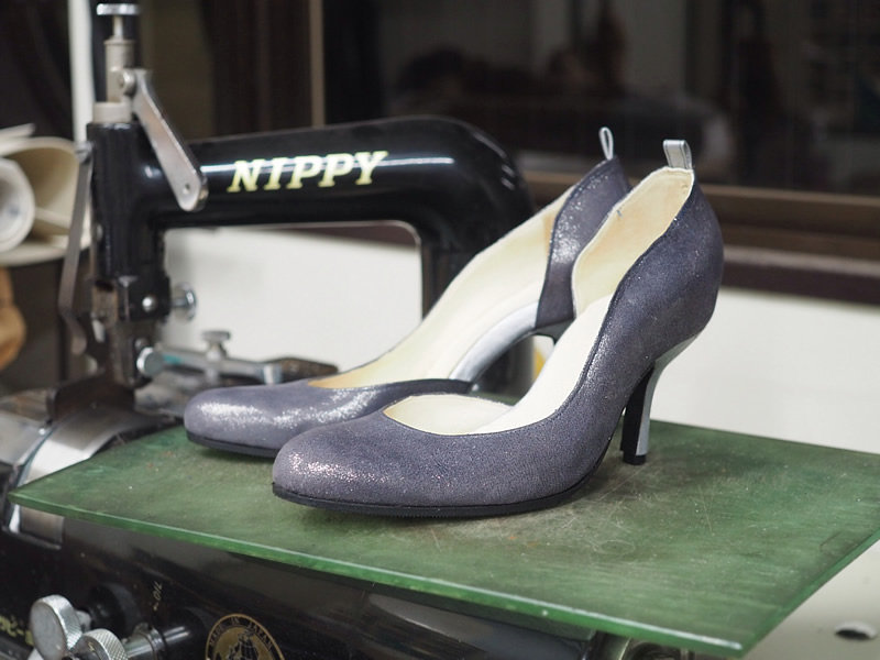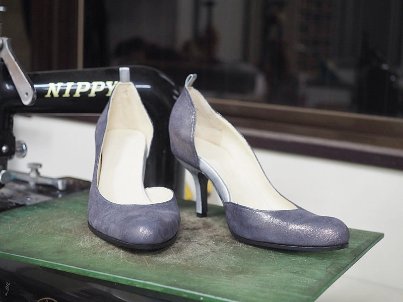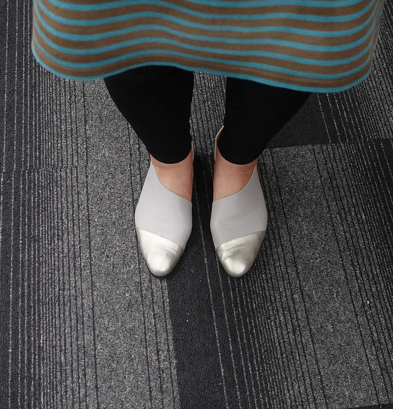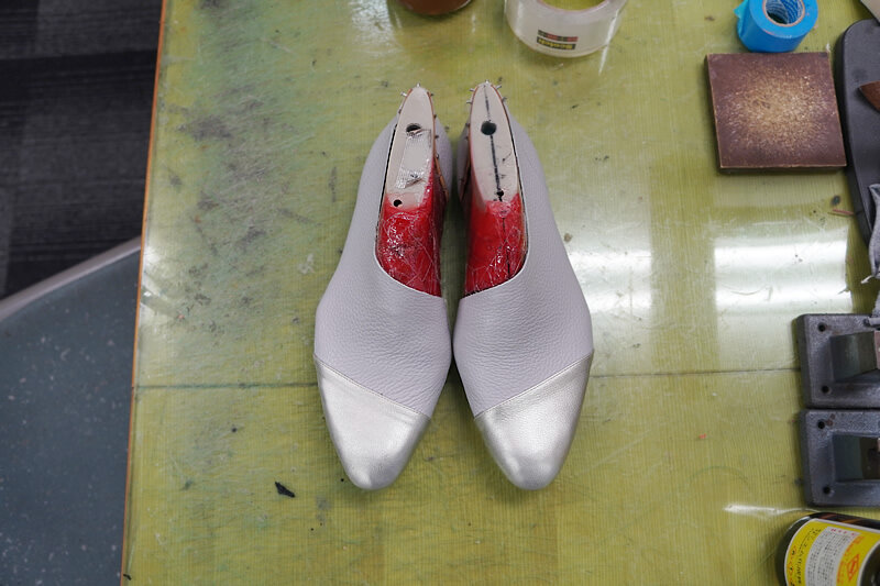 趣味コースの生徒さん、2作目はシルバーメタリックの革でフラットパンプスが完成