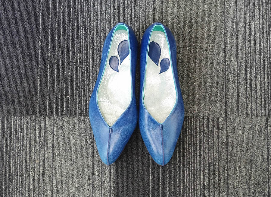 雨の雫のようなかたちの、ブルーのアクセントを中敷きに置いて、履き心地だけでなく見た目も楽しい作品に仕上げています☆彡