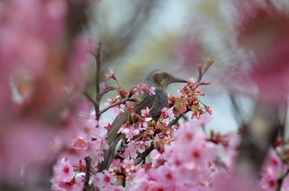 入り口の「八重桜」にて 「ヒヨドリ(教えて頂き)」が迎えてくれました
