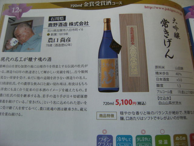 12月の金賞受賞720mlコースからは、加賀の銘酒常きげんの大吟醸が登場です