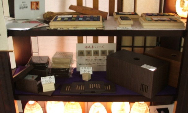 こだわりの和雑貨の中に、源氏香デザインのコースター・ペンホルダー・ティッシュケース等が並べられています。