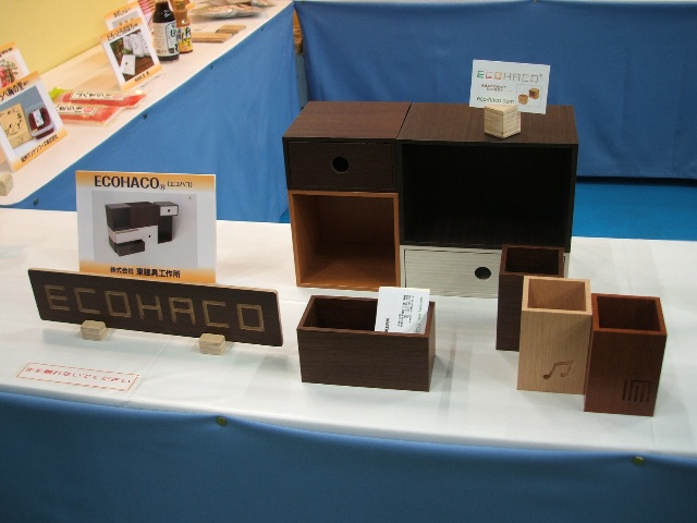 小間 NO.12 和歌山県建具事業協同組合のブースの一角のECOHACOコーナーにパーテーションをはじめ、インテリア家具・ステイショナリー小物等 並びます。