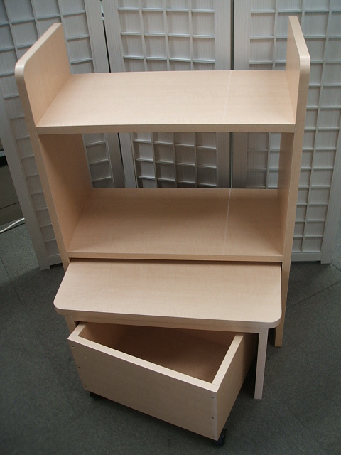 角を丸くして、安全面にも配慮しております。小さいお子様のお絵かきなどの遊び机として、お使い下さい。下のBOXは、スケッチブックが入る大きさになっていますので、おもちゃ等の収納にお使いいただけます。お子様にも、出し入れしやすい様に、キャスター付なので、後片付けを自発的にやってくれるのでは・・・。